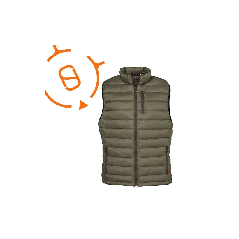 GILET MATELASSÉ TREKKING 100% polyamide traité déperlant, rembourrage 100% polyester fibre creuse, doublure 100% polyamide. 2 poches basses zippées, 1 poche poitrine zippée. Supporte une pluie légère, souple silencieux, facile à entretenir.
