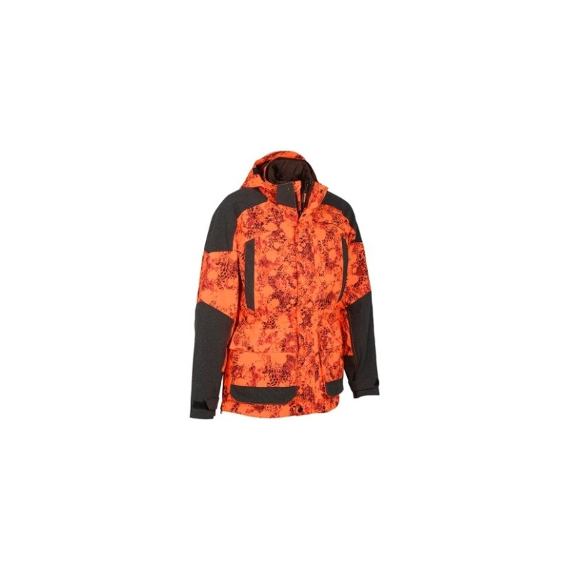Veste 3 en 1, polyvalente, souple, étanche et respirante.La version Viper Blaze est constituée de 2 tissus : (1) 100% polyester ripstop extensible, (2) 92% polyester, 8% spandex ripstop. Tissus laminés avec une membrane microporeuse imperméable et respirante, coutures étanches. Capuche tempête ajustable et détachable. Système daération sous les bras.Poches repose-mains zippées. 1 poche radio zippée. 1 poche Napoléon zippée, 2 grandes poches basses avec cartouchières intégrées et pattes de maintien douverture. Cordon de resserrage à la taille. Fentes côtés. Zip double curseur sous patte centrale. Bas de manche réglable. A l'intérieur: 3 poches zippées,1 poche bracelet. Carnier doublé étanché et détachable sur trois côtés.Gilet amovible matelassé, extérieur, intérieur polaire et garnissage 100% polyester. 2 poches extérieures et 2 poches intérieures zipées. LE NOUVEAU CAMOUFLAGE VIPER BLAZE EST UNE EXCLUSIVITÉ PROHUNT. Normé CE, haute visibilité,il s'inspire de motifs reptiliens permettant de casser l'uniformité des silhouettes et de fondre - aux yeux du grand gibier -le chasseur dans son biotope.