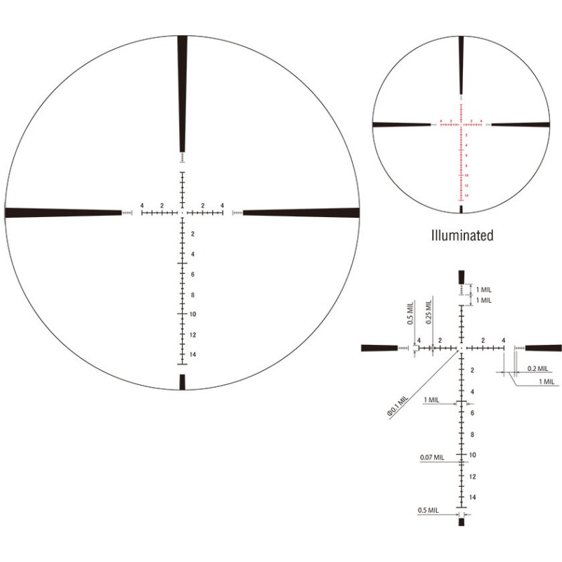 Une caractéristique de la conception du premier plan focal, également appelée FFP, est que la valeur de l'échelle du réticule ne change pas sur toute la plage de zoom. De plus, le point de visée (POA) ne change pas sur toute la plage de zoom. L'utilisation du réticule pour la télémétrie et également avec les graphiques de chute de trajectoire est beaucoup plus simple. Cependant, l'échelle du réticule devient plus épaisse lorsque le grossissement est augmenté.