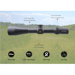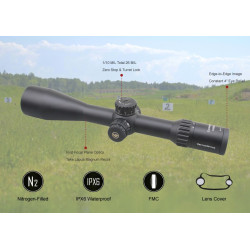 Vector Optics Top Line Premium qui peut rivaliser avec la plupart des optiques de marque célèbres dans le monde entier Monotube de 34 mm en 6061 T6, premier oscilloscope à plan focal avec verre Schott ED HD allemand Système optique allemand en utilisant la lentille LaREE et VePRO FMC,> 90% de transmission lumineuse Très peu de distorsion, très faible dispersion, excellent pour l'aube, le crépuscule même la prise de vue de nuit Véritable facteur de zoom 6x, dégagement oculaire constant de 4 "sans anneau sombre intérieur autour de l'image Éclairage rouge à 6 niveaux, mise au point latérale parallaxe minimale de 10 mètres à l'infini Système de réglage en 7075 T6 qui n'accroche jamais rien et ne se tourne jamais Ajustement de 1 / 10MIL Zero-Stop & Turret Lock, 100 clics par round, 26MIL Elevation Range Réticule tactique MIL en verre gravé VCT-34FFP, point central éclairé par des lignes et des points numériques Prenez Lapua Magnum 338 Recoil et tous les domaines d'application pour la chasse, le sport et la compétition