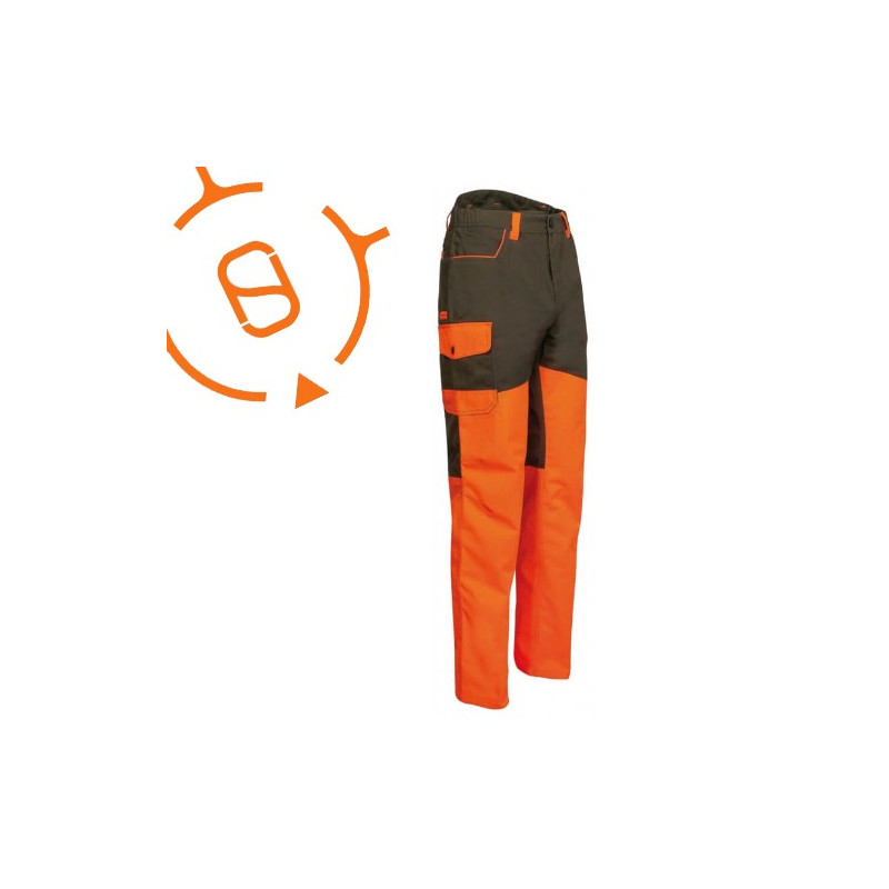 65% polyester, 35% coton, traité déperlant. Renforts 100% polyester oxford 600 deniers enduction polyuréthane, imperméables et résistants. 6 poches dont 1 poche couteau, ceinture antiglisse, élastiquée et montante dans le dos, genoux préformés, bas à lacets • COLORIS : Kaki (1033) - orange normé CE (1033) - GC B&B normé CE (10155) • TAILLES : 38-60