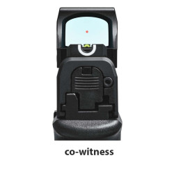 La conception du châssis intègre également une base à profil bas avec queue d'aronde intégrée pour assurer une polyvalence « Co-Witness » avec la plupart des pistolets ainsi qu'une pente progressive vers l'arrière.