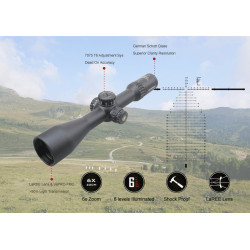 Vector Optics Top Line Premium qui peut rivaliser avec la plupart des optiques de marque célèbres dans le monde entier Monotube de 34 mm en 6061 T6, premier oscilloscope à plan focal avec verre Schott ED HD allemand Système optique allemand en utilisant la lentille LaREE et VePRO FMC,> 90% de transmission lumineuse Très peu de distorsion, très faible dispersion, excellent pour l'aube, le crépuscule même la prise de vue de nuit Véritable facteur de zoom 6x, dégagement oculaire constant de 4 "sans anneau sombre intérieur autour de l'image Éclairage rouge à 6 niveaux, mise au point latérale parallaxe minimale de 10 mètres à l'infini Système de réglage en 7075 T6 qui n'accroche jamais rien et ne se tourne jamais Ajustement de 1 / 10MIL Zero-Stop & Turret Lock, 100 clics par round, 26MIL Elevation Range Réticule tactique MIL en verre gravé VCT-34FFP, point central éclairé par des lignes et des points numériques Prenez Lapua Magnum 338 Recoil et tous les domaines d'application pour la chasse, le sport et la compétition