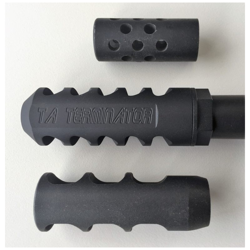 Le frein de bouche TA Terminator est KG Gunkoted Black & déployé en standard pour prendre un calibre maximum de la .338 Lapua Magnum.