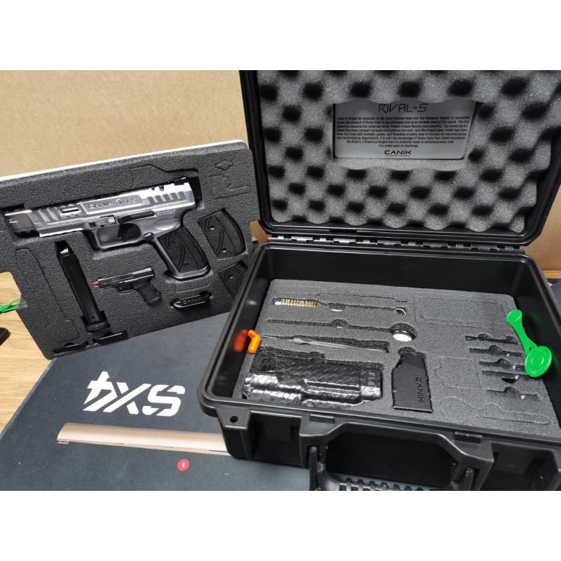 Il est livre dans une mallette rigide sur deux etages avec differents accessoires (Chargeurs, grips, kit de nettoyage, holster, platines point rouge, puits de chargeur, outil de demontage...)