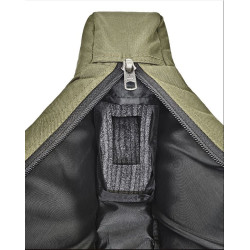 L'extérieur comprend une poche extérieure zippée, une large fermeture éclair YKK à double sens, des sangles de transport aux coutures renforcées et une bandoulière réglable en longueur grâce à une boucle.